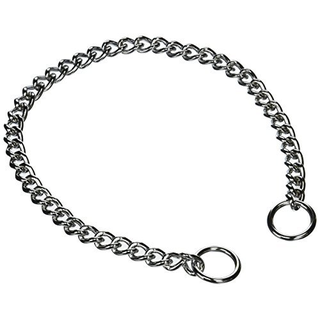 Chrome plated, Rugged and strong. For correct size, measure around the dog's neck and add 2 1/2 to 3 inches