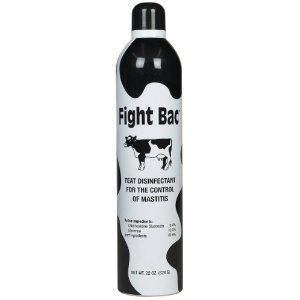 Fight Bac teat disinfectant aerosol spray can greatly reduce the spread of mastitis, because nothing touches the cow. Non-irritating formula helps keep teats in top condition, prevent waste and is easy to use. Contains chlorhexidine gluconate 0.4% and glycerin 10%. Contains no CFUs. One can will treat 300 cows, Not for sale in AK, HI, MP, PR, VI Size:22 Oz.