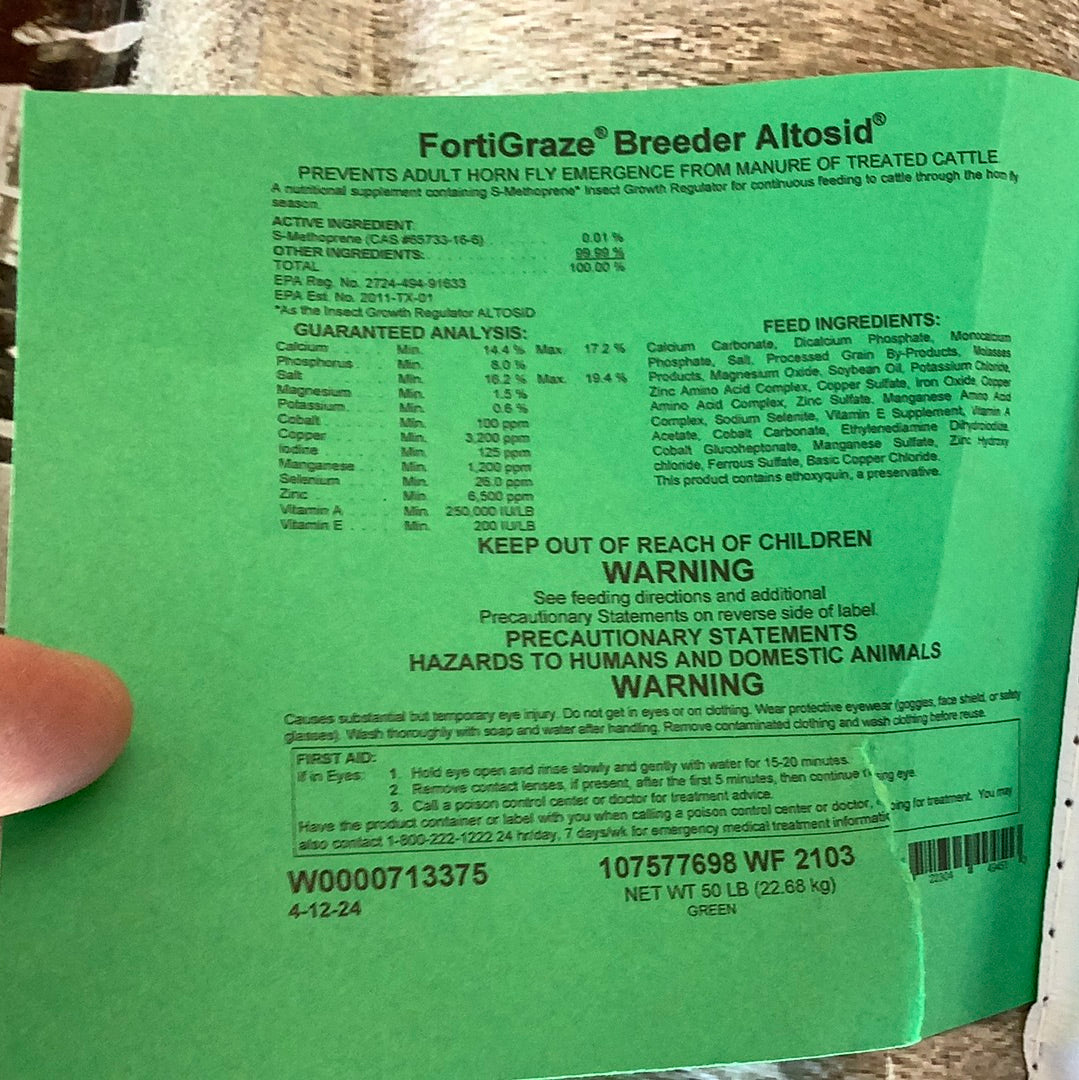 FortiGraze® Breeder: Higher Vitamin E levels to aid reproduction tract heal up. Uses higher levels of Cu, Mn, Co, and Zn. 1/3 Organic Zinpro®, 1/3 Intellibond®, and 1/3 Sulfates. These help increase health and reproduction in new calves and cows respectively. INTAKE: 3 oz
