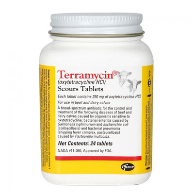 TERRAMYCIN (oxytetracycline HCI) Scours Tablets is an oral formulation of oxytetracycline, a versatile, broad-spectrum antibiotic for use in dairy & beef calves. A broad-spectrum antibiotic for treatment and control of pneumonia and bacterialscours in beef & dairy calves. Potent antibacterial activity; each tablet contains 250 mg of oxytetracycline HCI. Recommended for treatment of shipping fever complex caused by Pasteurella multocida and enteritis (scours) caused by E. coli (colibacillosis) and Salmonella typhimurium. Readily absorbed from the digestive tract. 7-day slaughter withdrawal. Contains 250 mg oxytetracycline HCl.
